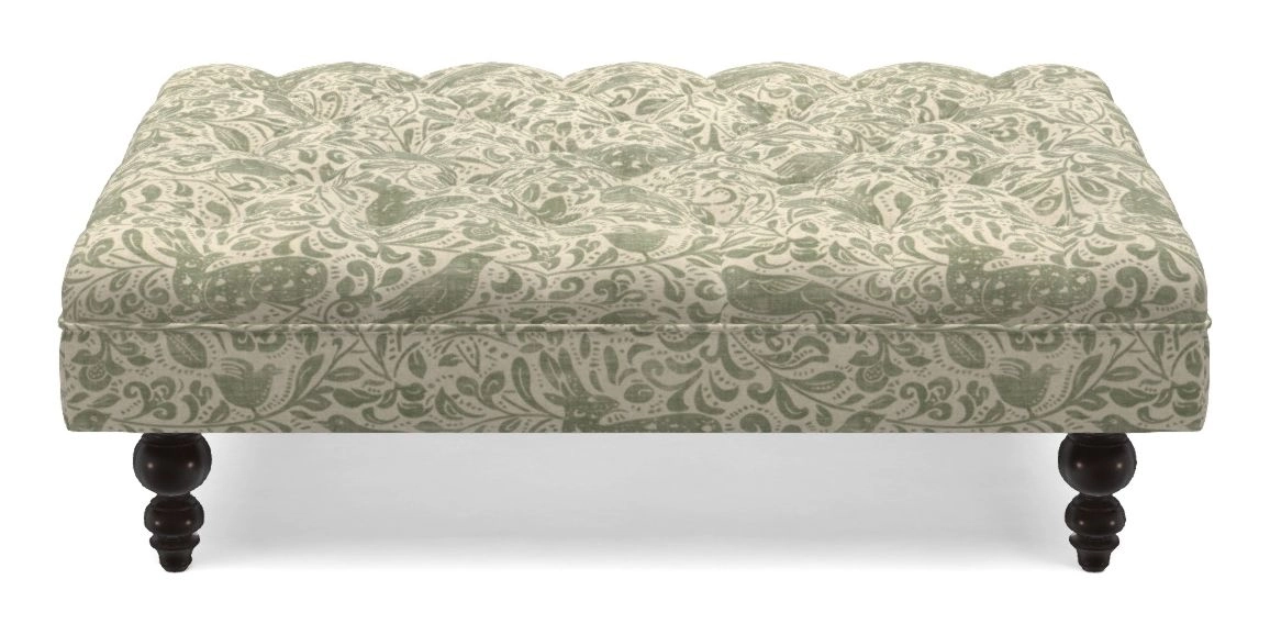 A traditionally styled, large, low rectangular footstool featuring classic buttoning and solid hardwood turned feet.