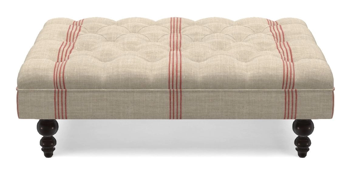 A traditionally styled, large, low rectangular footstool featuring classic buttoning and solid hardwood turned feet.