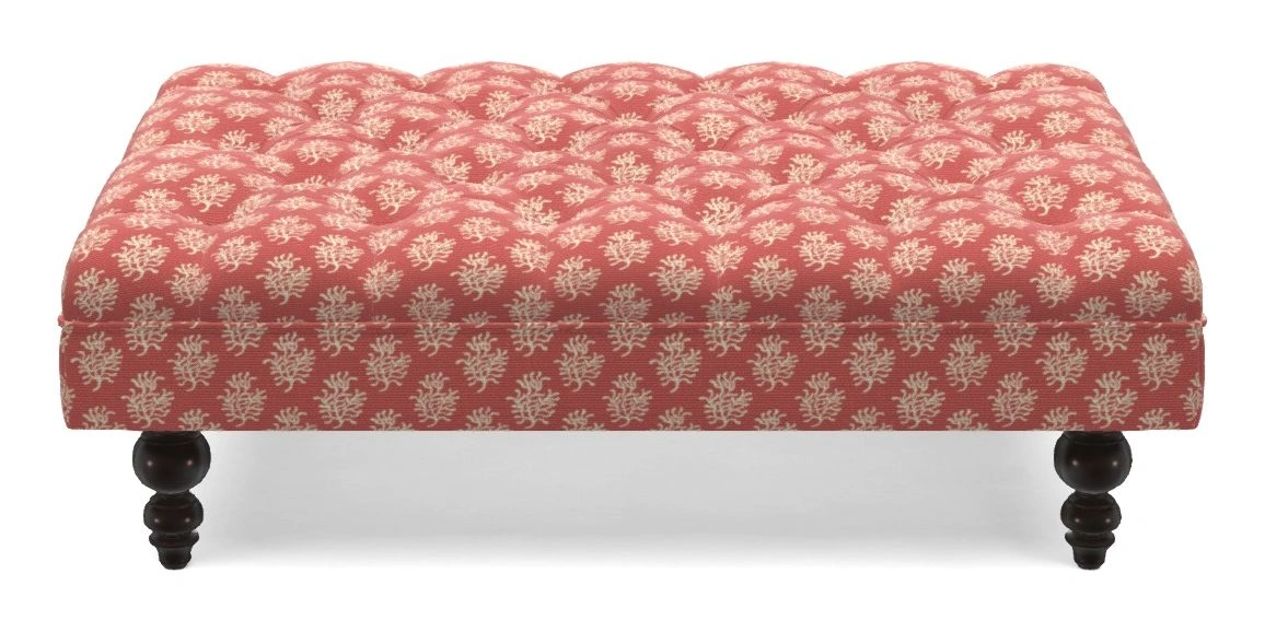 A traditionally styled, large, low rectangular footstool featuring classic buttoning and solid hardwood turned feet.