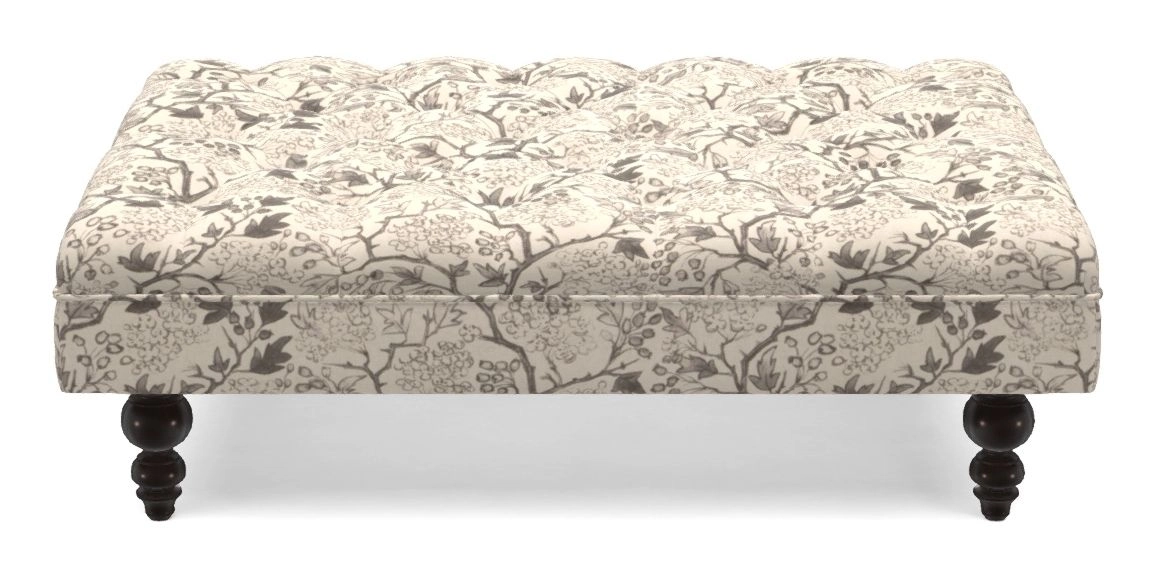 A traditionally styled, large, low rectangular footstool featuring classic buttoning and solid hardwood turned feet.