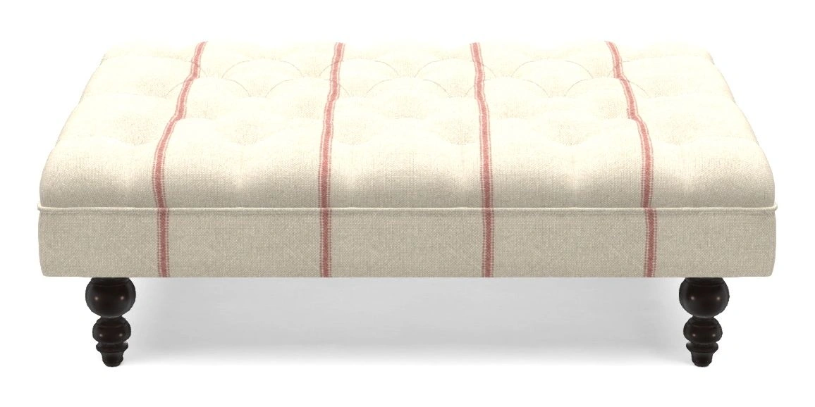 A traditionally styled, large, low rectangular footstool featuring classic buttoning and solid hardwood turned feet.
