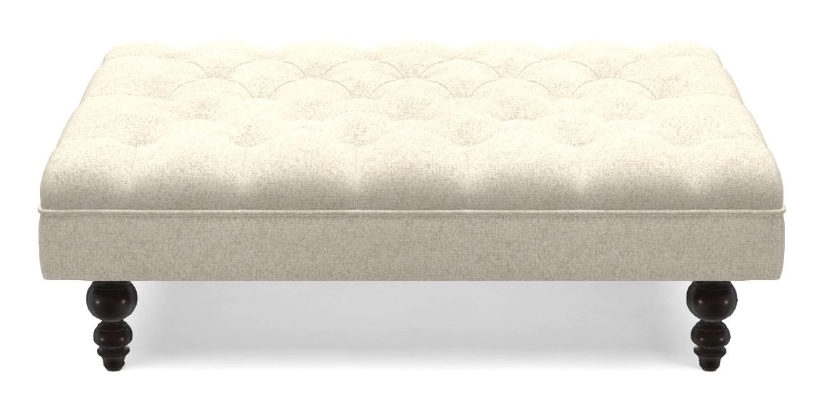 A traditionally styled, large, low rectangular footstool featuring classic buttoning and solid hardwood turned feet.