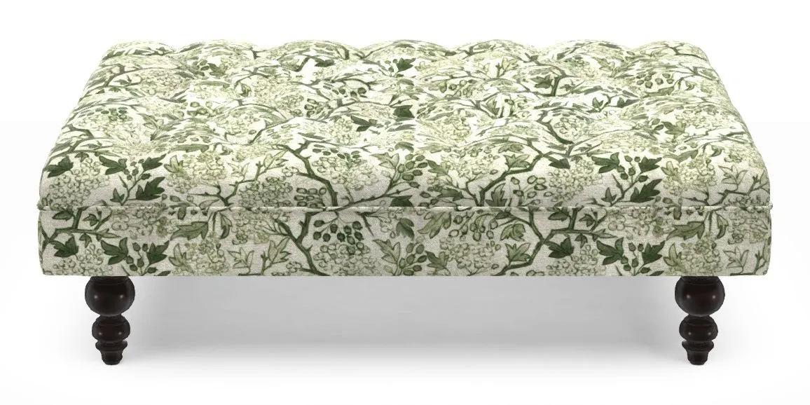A traditionally styled, large, low rectangular footstool featuring classic buttoning and solid hardwood turned feet.