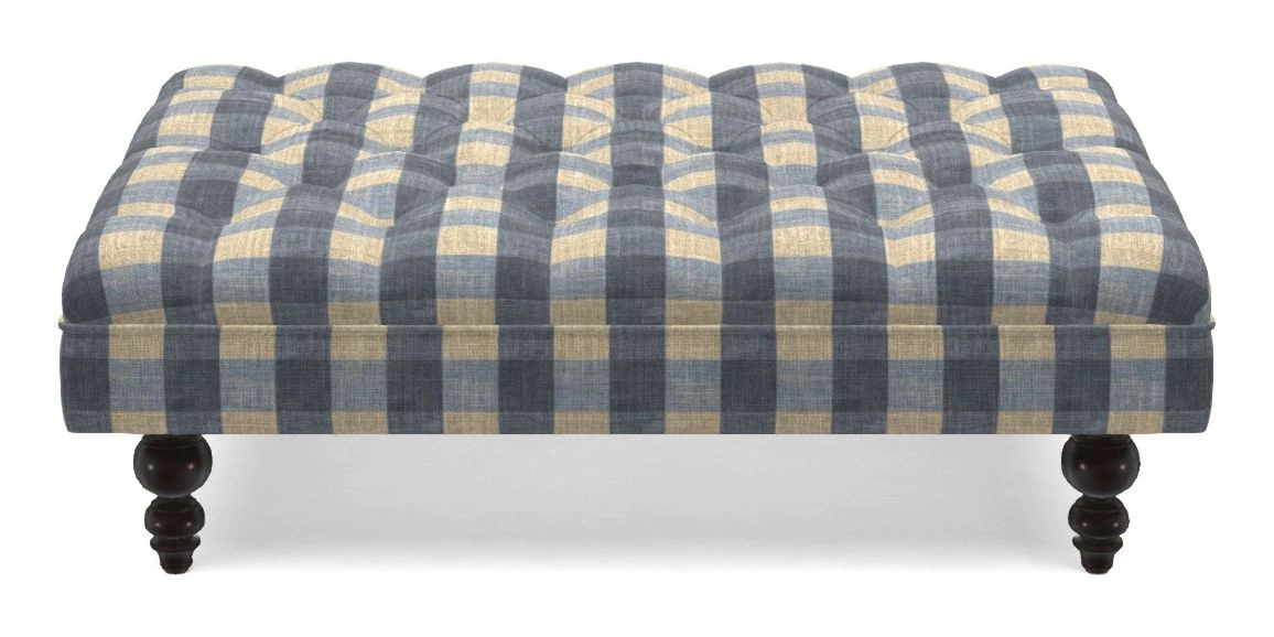 A traditionally styled, large, low rectangular footstool featuring classic buttoning and solid hardwood turned feet.
