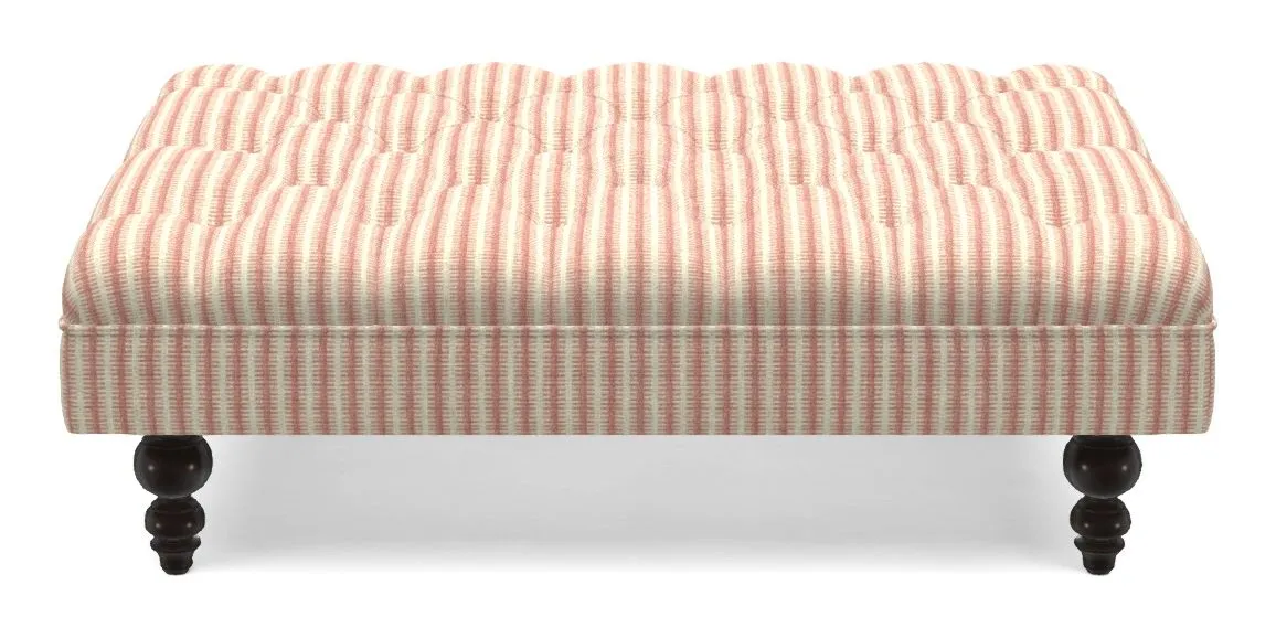 A traditionally styled, large, low rectangular footstool featuring classic buttoning and solid hardwood turned feet.