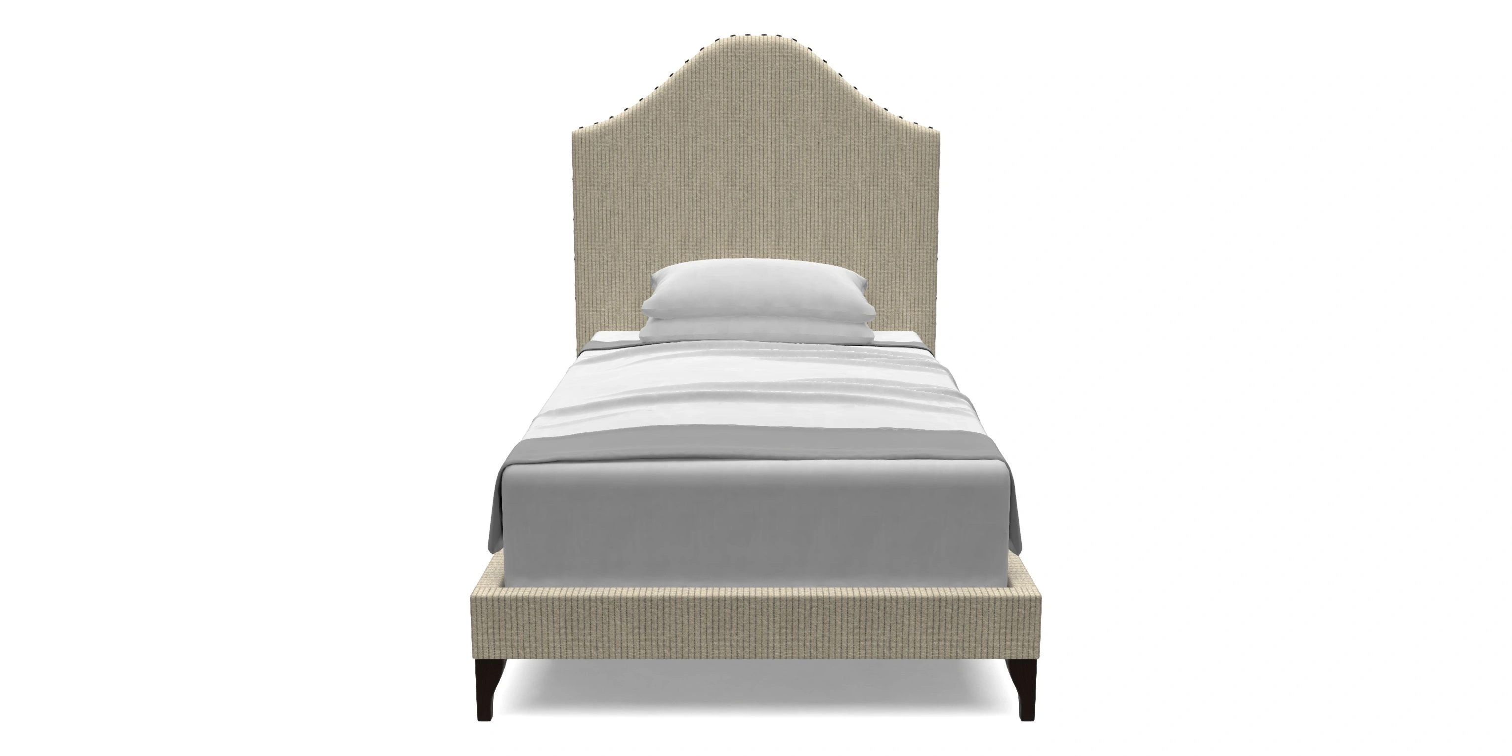 Headboard: Curved headboard with widely spread hand studding.