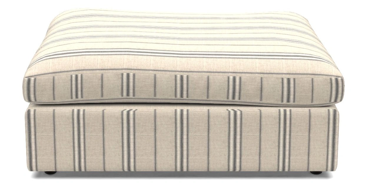 A large, cushioned box-shaped stool on dark-stained solid wood glide feet. Comfortable as a footrest and ideal for holding books, magazines, or a tray of tea and treats. View other products in this range.