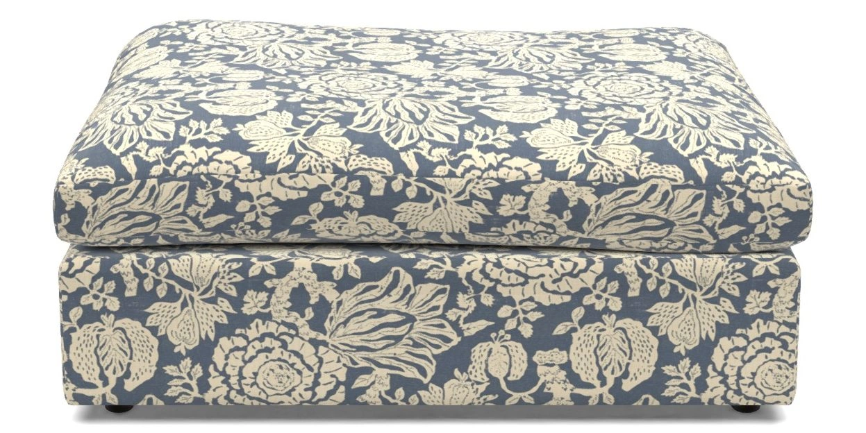 A large, cushioned box-shaped stool on dark-stained solid wood glide feet. Comfortable as a footrest and ideal for holding books, magazines, or a tray of tea and treats. View other products in this range.