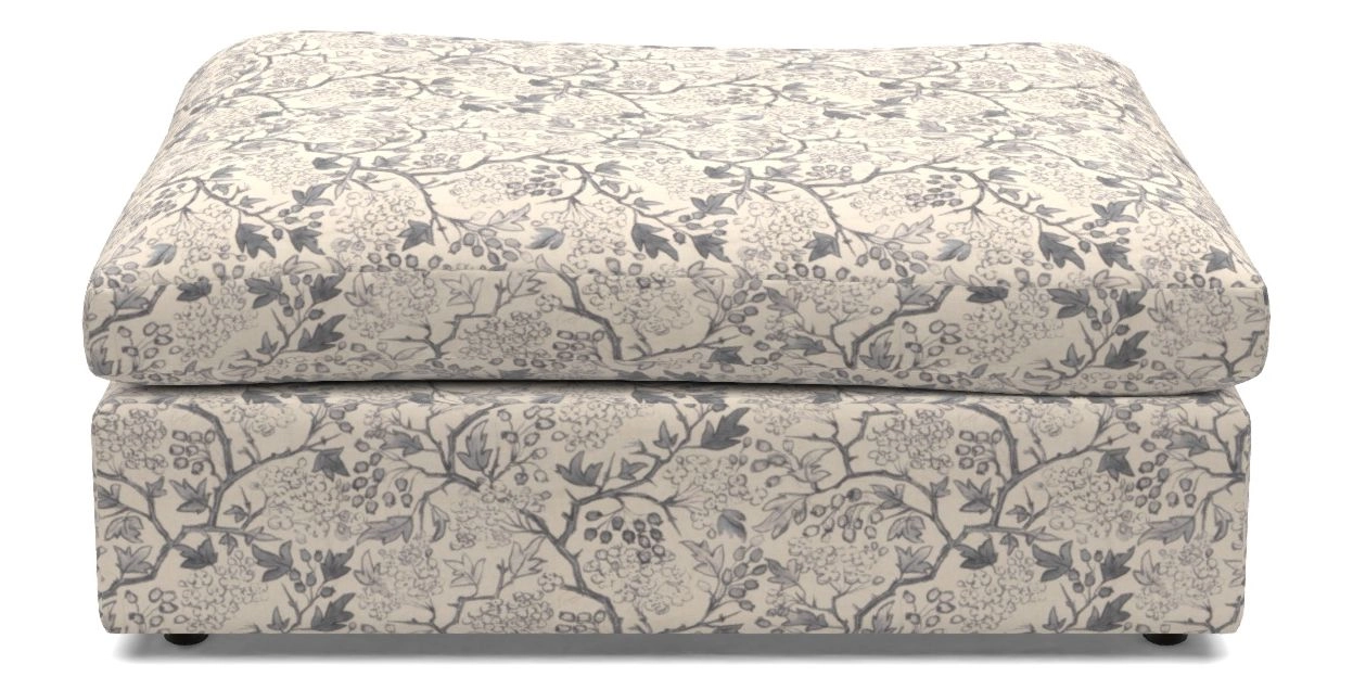 A large, cushioned box-shaped stool on dark-stained solid wood glide feet. Comfortable as a footrest and ideal for holding books, magazines, or a tray of tea and treats. View other products in this range.