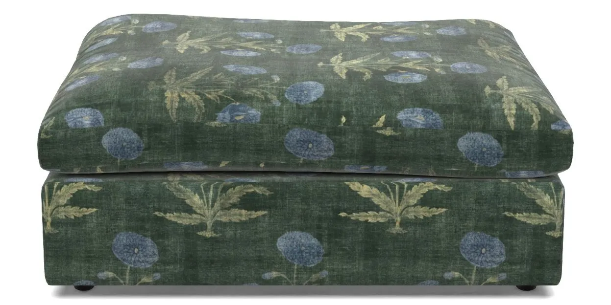 A large, cushioned box-shaped stool on dark-stained solid wood glide feet. Comfortable as a footrest and ideal for holding books, magazines, or a tray of tea and treats. View other products in this range.