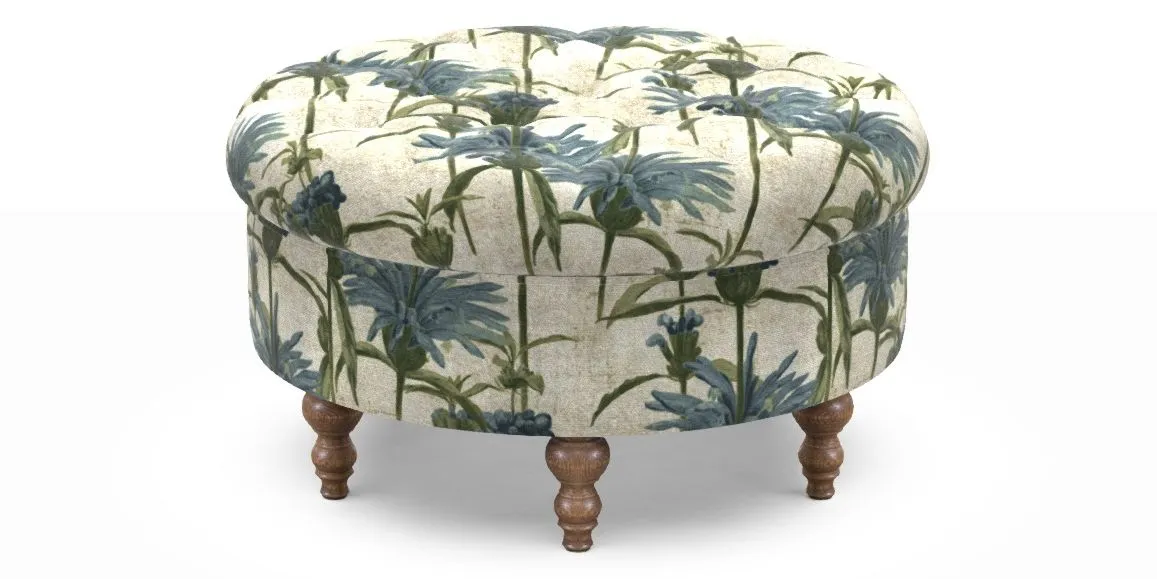 A round, deep-buttoned footstool design that provides a comfortable spot for resting feet or serving a tray of tea. A stylish and practical addition to any space.