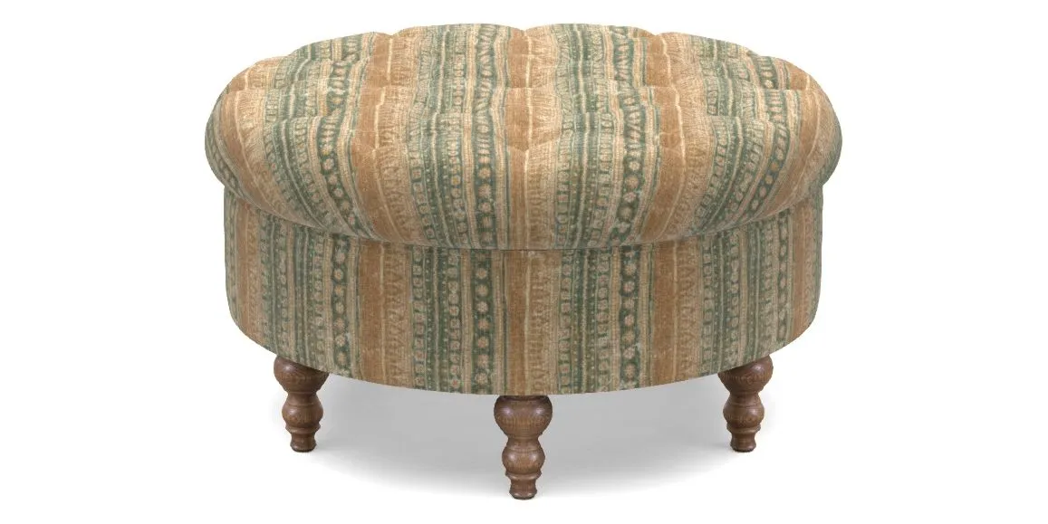 A round, deep-buttoned footstool design that provides a comfortable spot for resting feet or serving a tray of tea. A stylish and practical addition to any space.