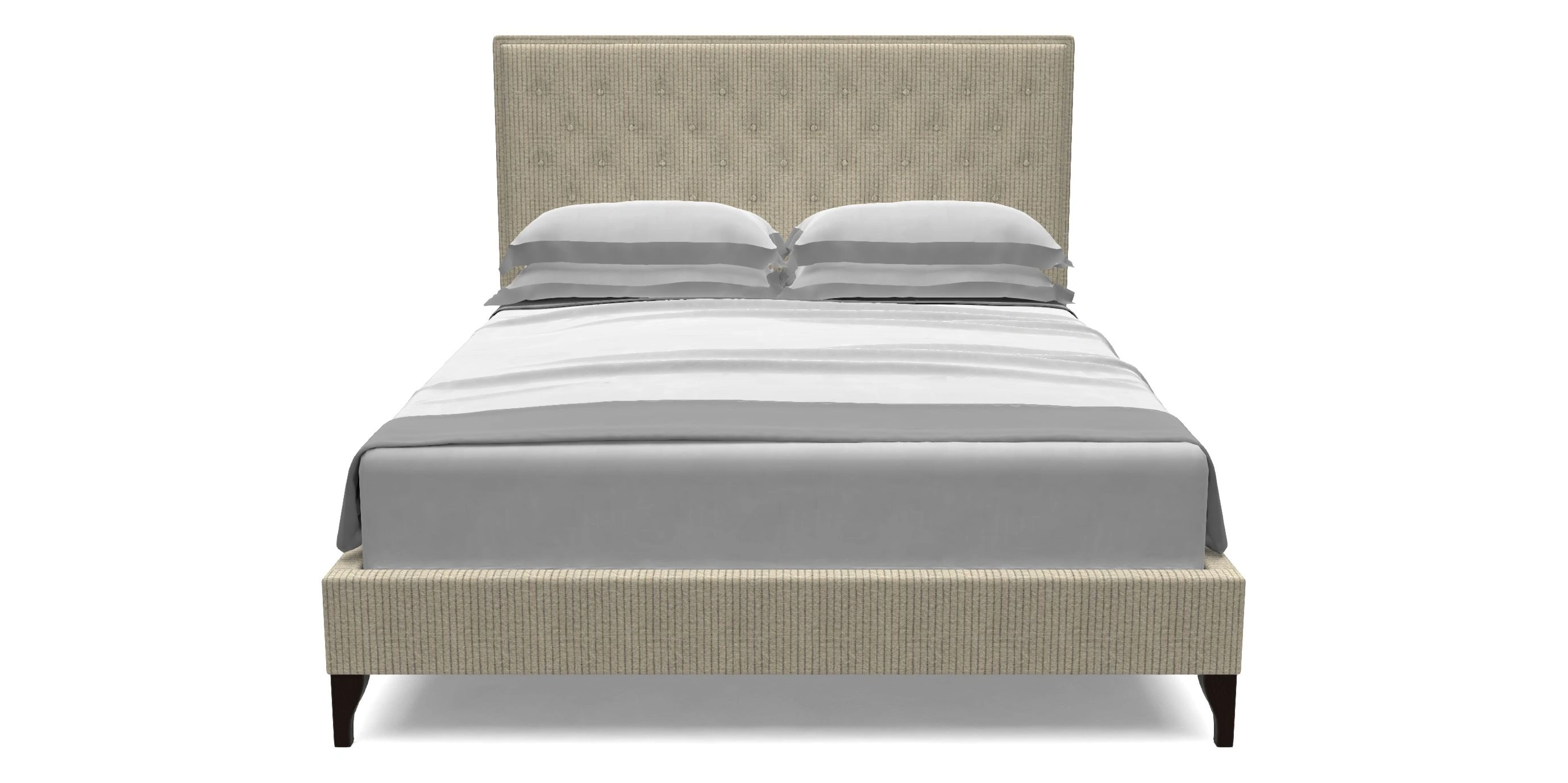 A contemporary twist on a classic luxury bed, featuring a distinctive double headboard design, shallow buttoning and piping for subtle texture and detailing. Its simple elegance is versatile enough to suit any fabric, making it an adaptable choice for numerous interior styles.