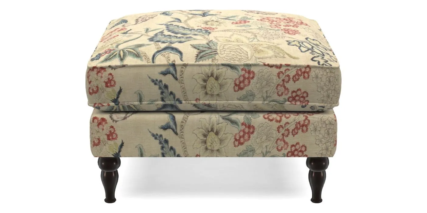 A square, deeply padded footstool with turned legs and castors, offering classic style with practicality. View other products in this range.