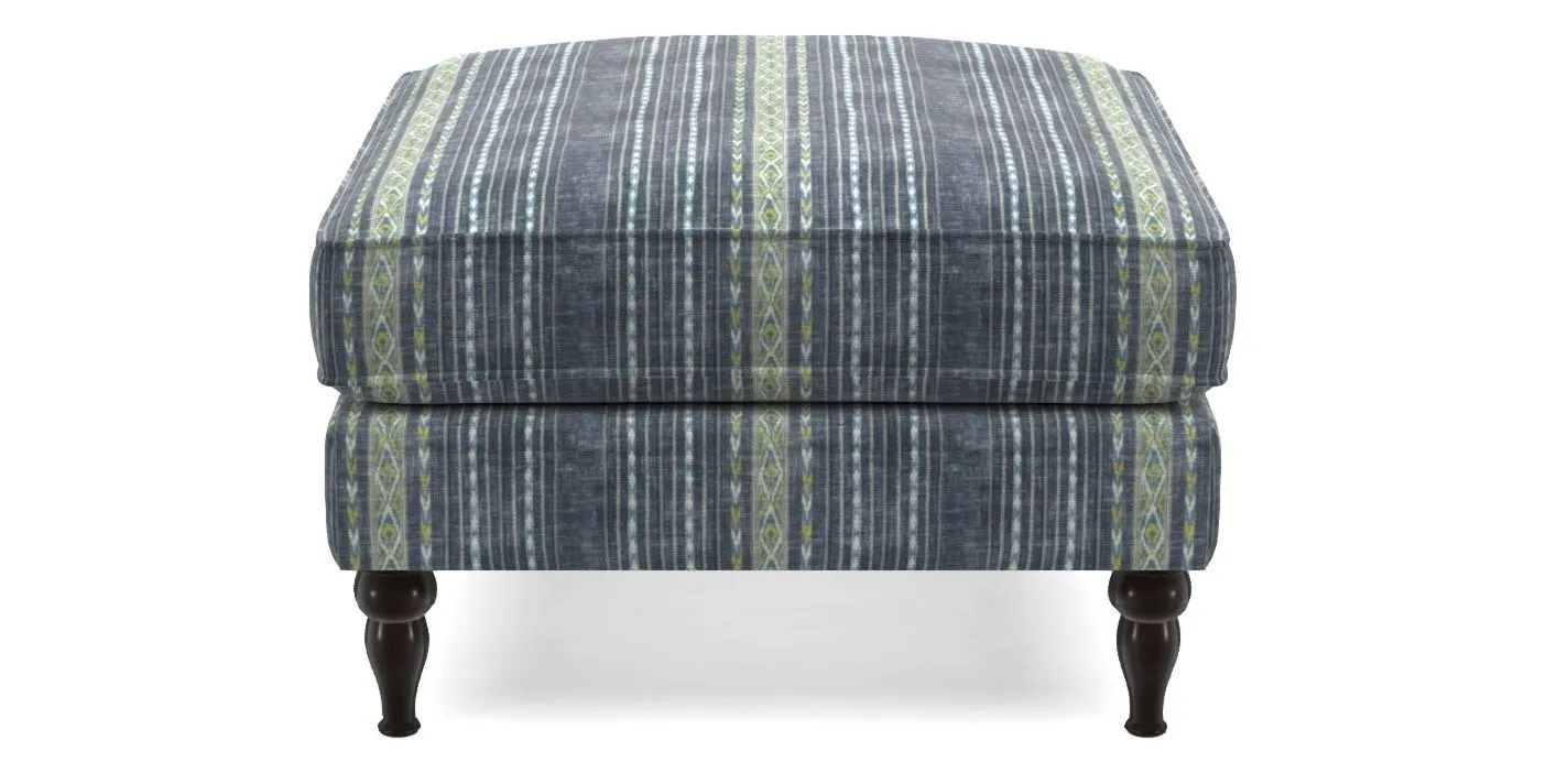 A square, deeply padded footstool with turned legs and castors, offering classic style with practicality. View other products in this range.