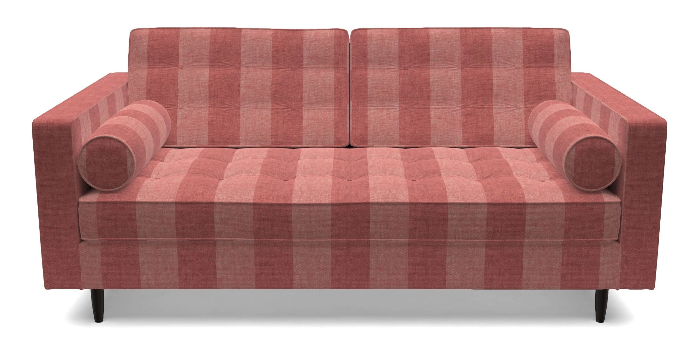 The Marylebone typifies mid-century design with clean square lines, buttoning, and low square arms. Its angular silhouette is complemented by a deep comfy seat and round bolster cushions, offering a chic yet comfortable seating option.