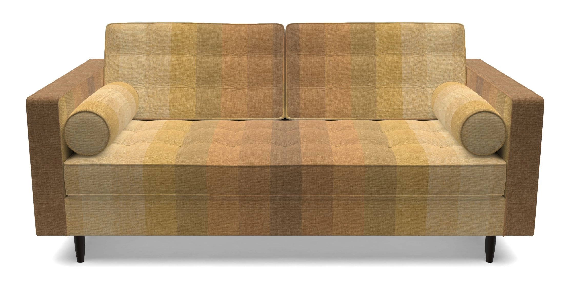 The Marylebone typifies mid-century design with clean square lines, buttoning, and low square arms. Its angular silhouette is complemented by a deep comfy seat and round bolster cushions, offering a chic yet comfortable seating option.