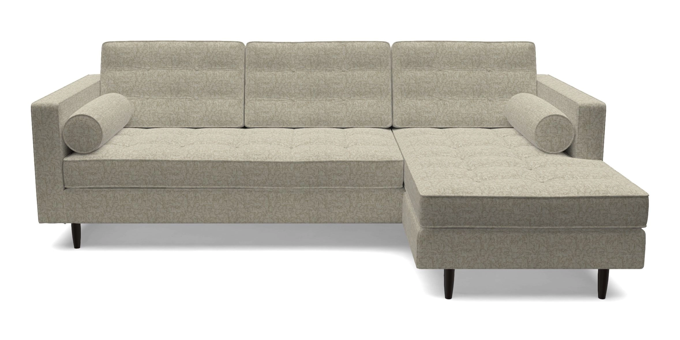 The Marylebone typifies mid-century design with clean square lines, buttoning, and low square arms. Its angular silhouette is complemented by a deep comfy seat and round bolster cushions, offering a chic yet comfortable seating option.
