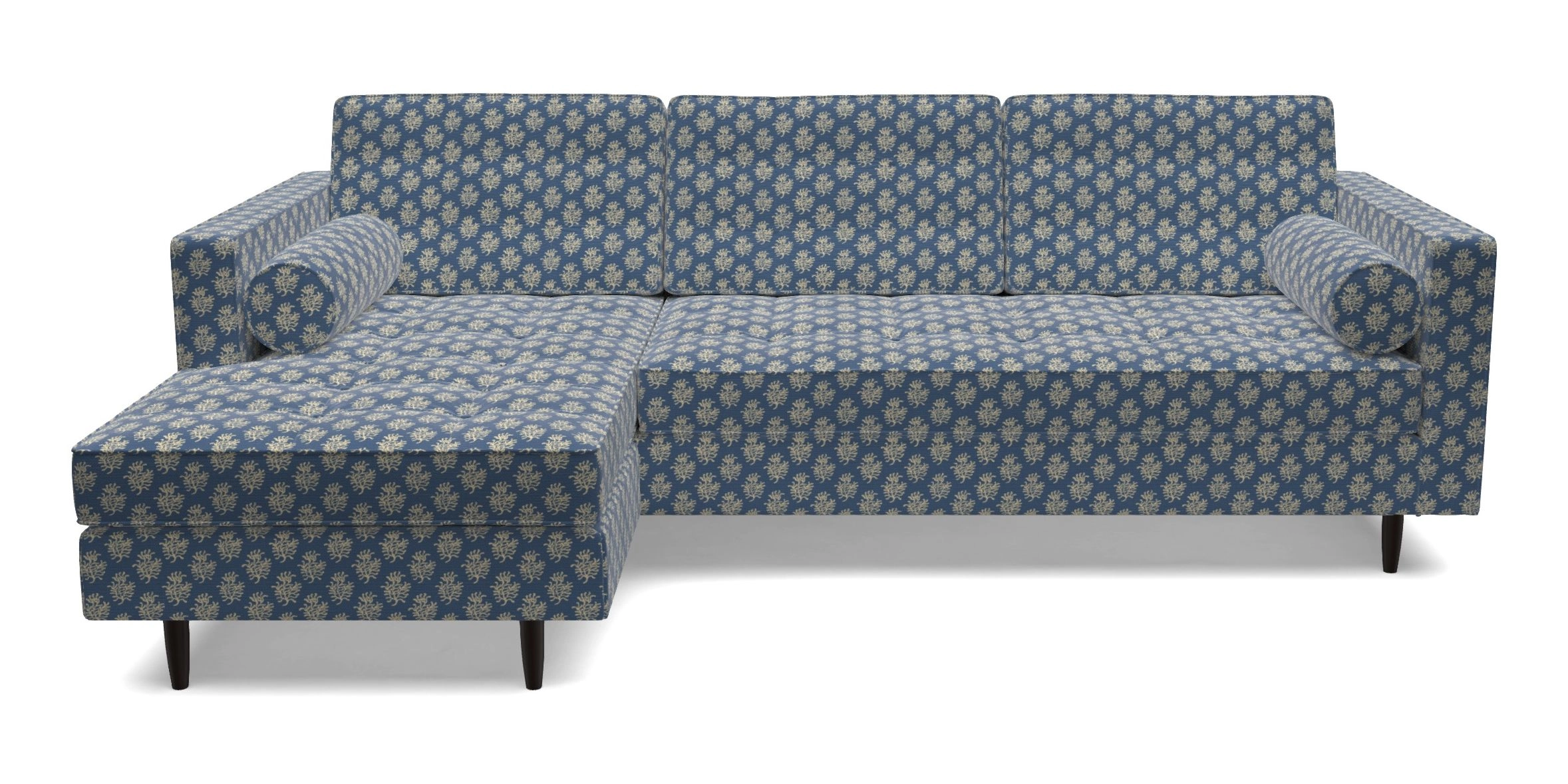 The Marylebone typifies mid-century design with clean square lines, buttoning, and low square arms. Its angular silhouette is complemented by a deep comfy seat and round bolster cushions, offering a chic yet comfortable seating option.