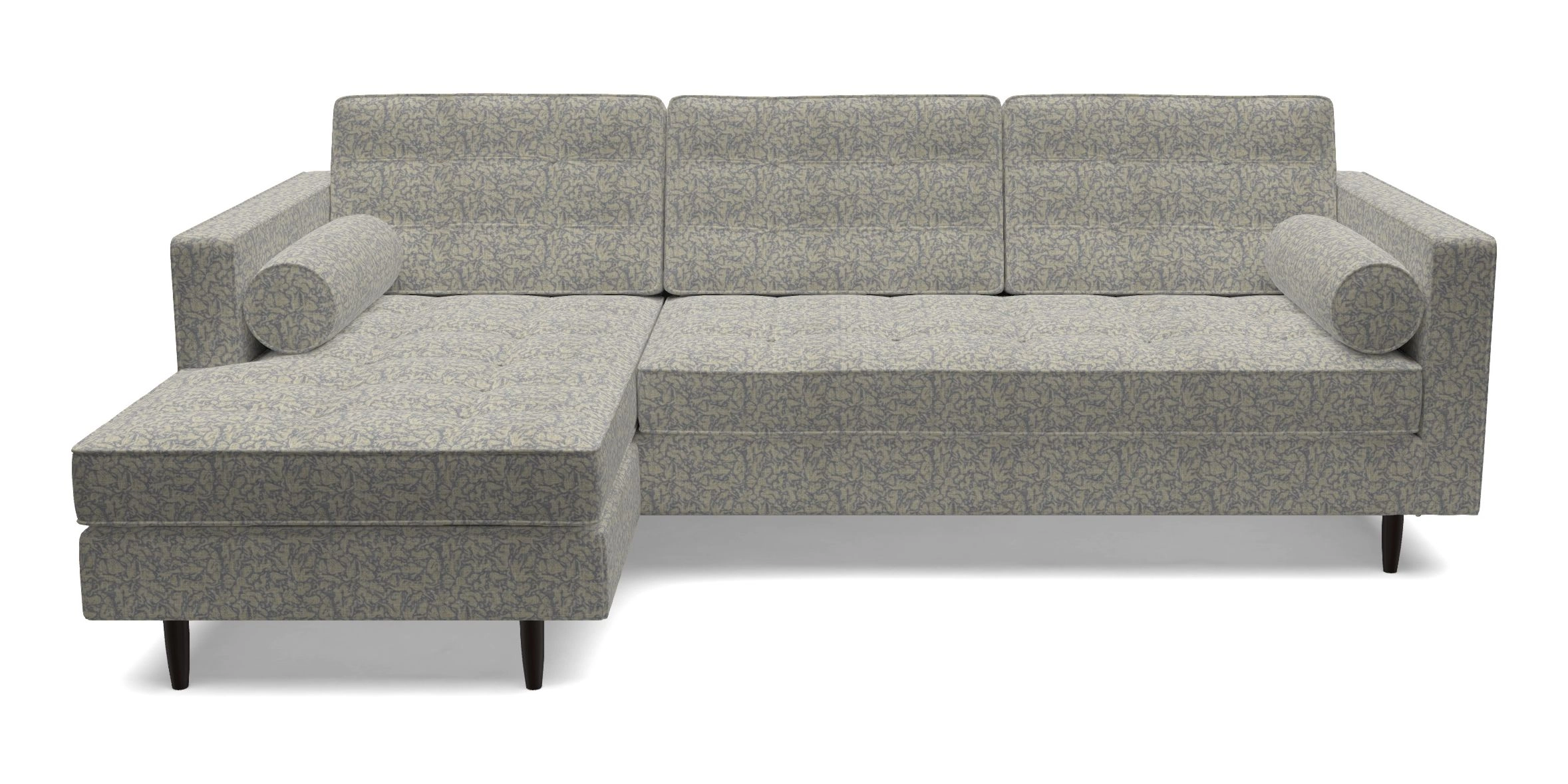 The Marylebone typifies mid-century design with clean square lines, buttoning, and low square arms. Its angular silhouette is complemented by a deep comfy seat and round bolster cushions, offering a chic yet comfortable seating option.