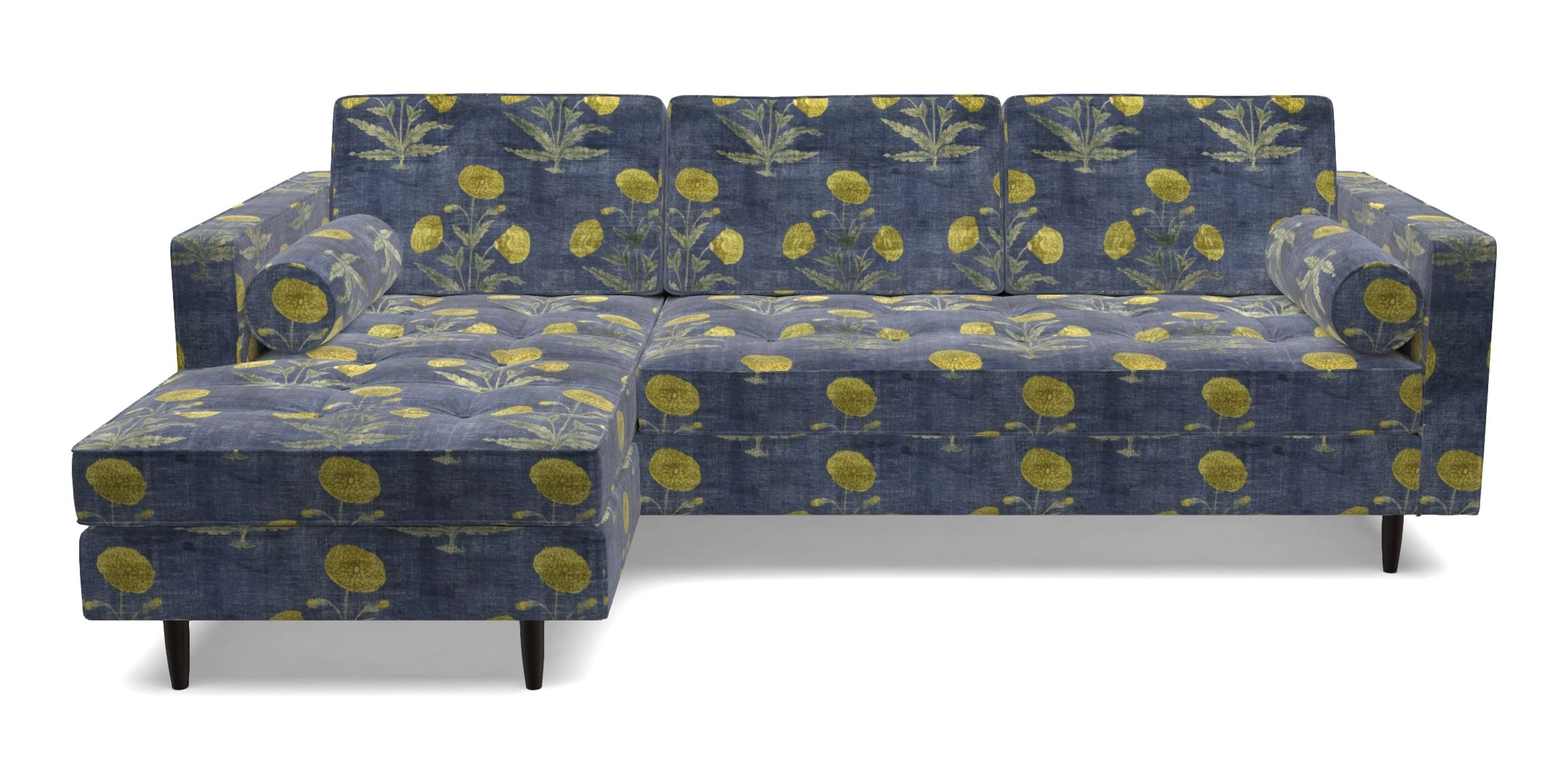 The Marylebone typifies mid-century design with clean square lines, buttoning, and low square arms. Its angular silhouette is complemented by a deep comfy seat and round bolster cushions, offering a chic yet comfortable seating option.
