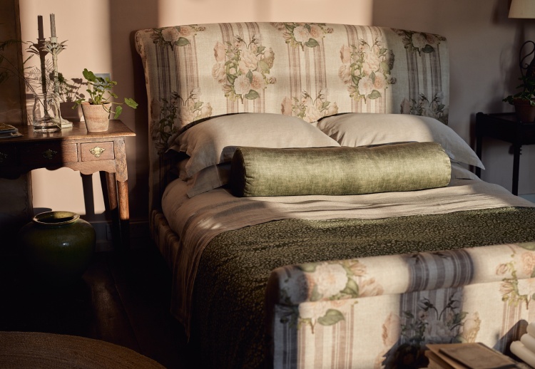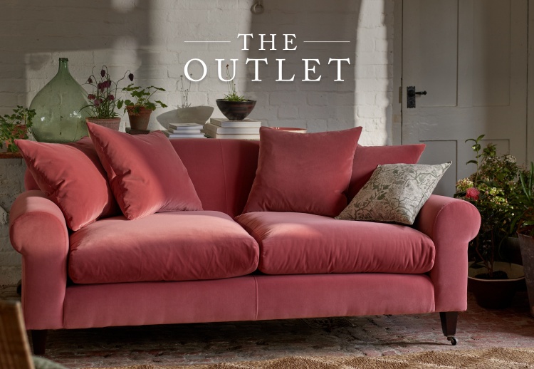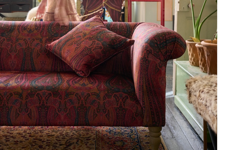 Grassington 2 Seater Sofa in RHS Botanicals on Velvet Ferns Toile Olive with scatter in Almost Plain Velvet Harvest Detail
